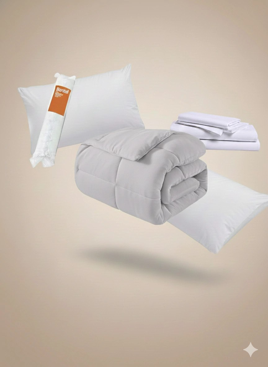Este combo ofrece un set completo para una cama de 2 plazas, combinando cubre cama, sábanas y almohada. Los tonos grises permiten una fácil combinación con otros elementos del dormitorio.