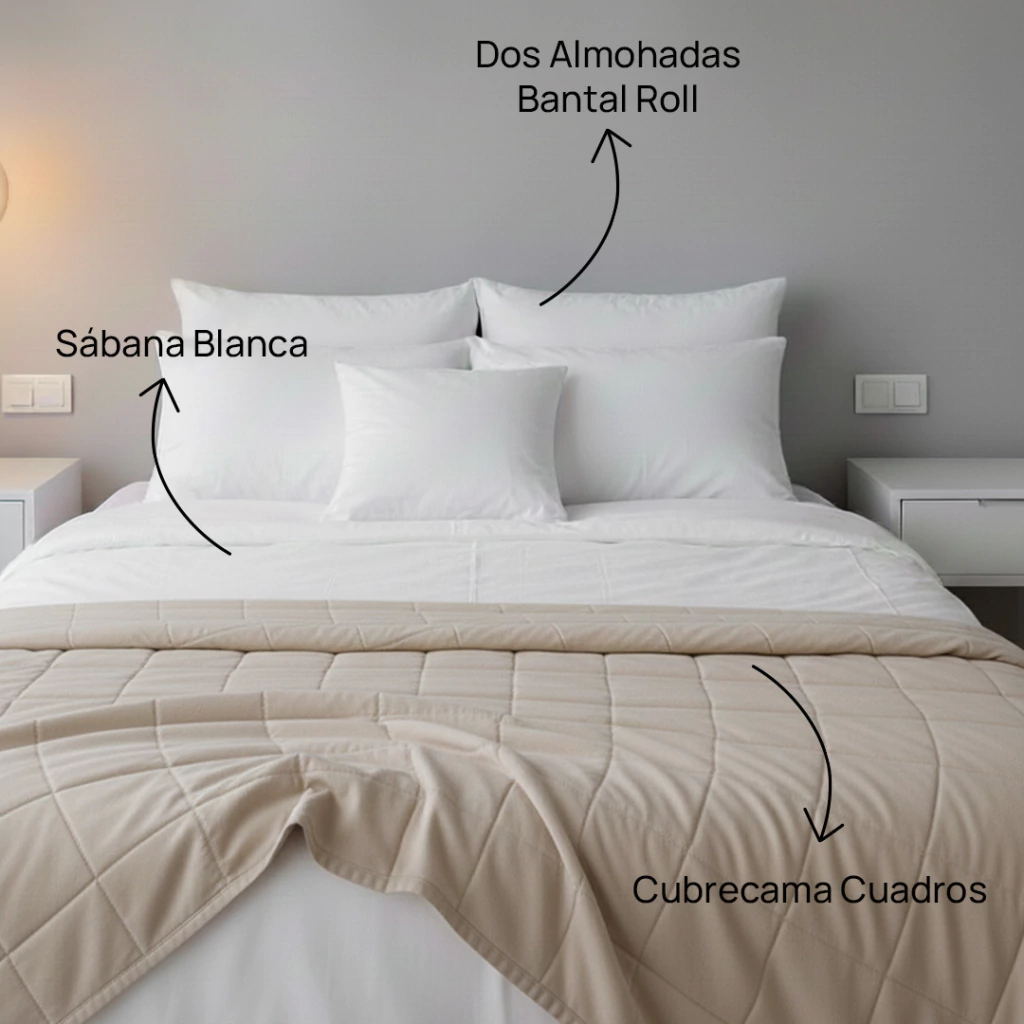 Este combo permite vestir una cama de 2 plazas con cubre cama, sábanas y almohada. Combina diseño clásico a cuadros con textiles suaves y prácticos para el uso diario.